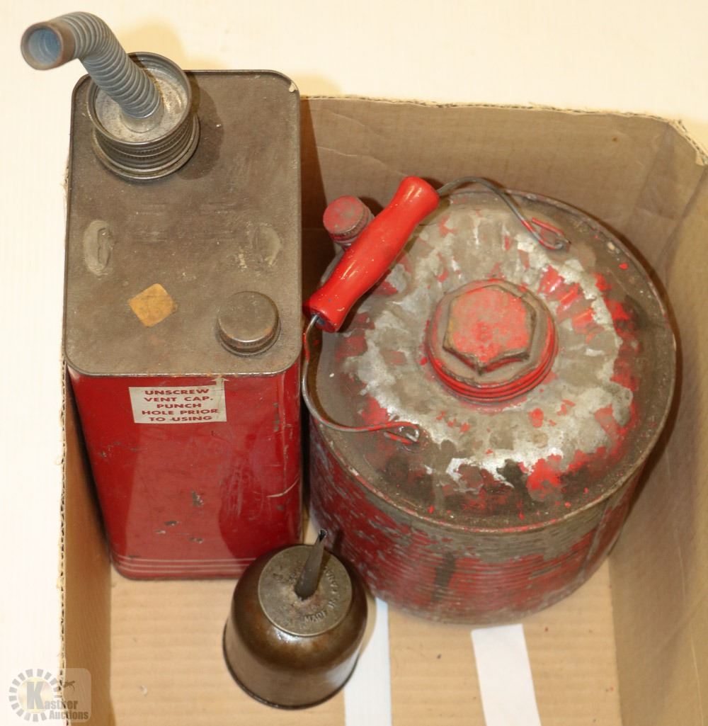 TWO VINTAGE GAS CANS AND METAL OIL CAN
