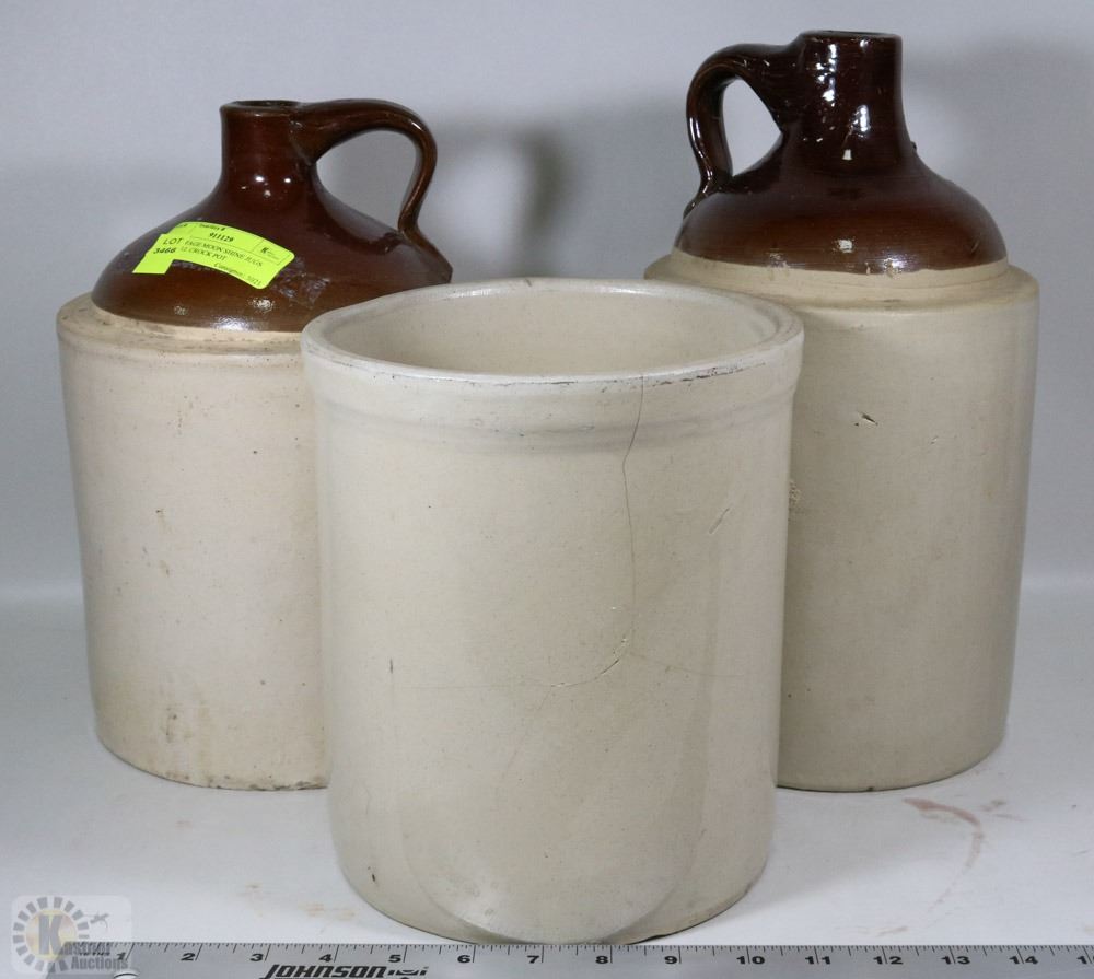 TWO VINTAGE MOON SHINE JUGS AND SMALL CROCK POT