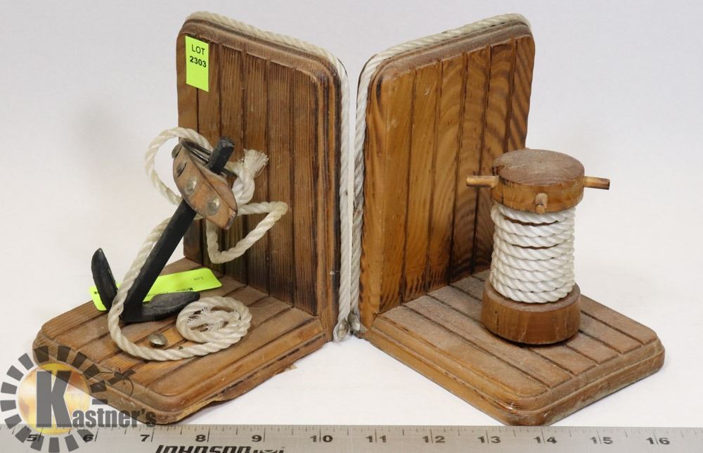 TWO WOODEN SHIP-THEMED BOOK ENDS