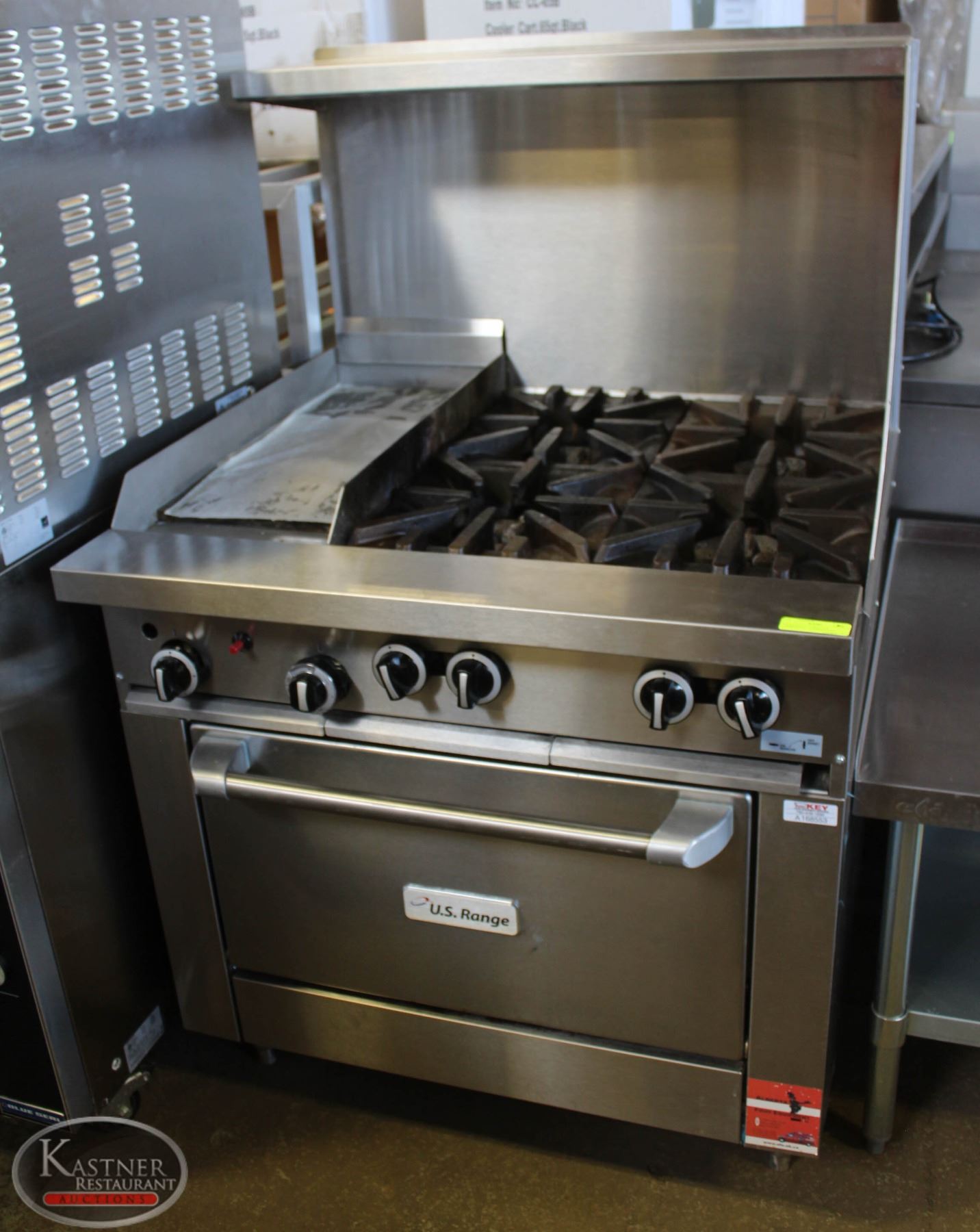 4 BURNER & 11-5/8" X 23" FLAT-TOP GRIDDLE, SINGLE OVEN WITH S/S SPLASHGUARD & OVERSHELF: 35-1/2" X 10-1/2". GREAT CONDITION. UNKNOWN MODEL. TOTAL DIMENSIONS: 35-1/2" X 35" X 36-57"