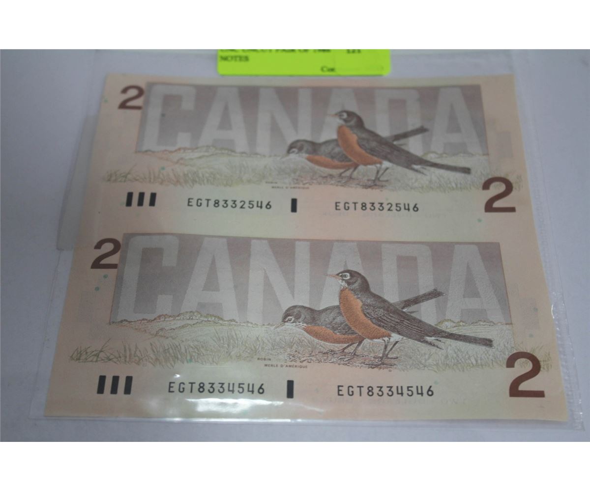 UNC UNCUT PAIR OF 1986 'ROBIN' $2 NOTES