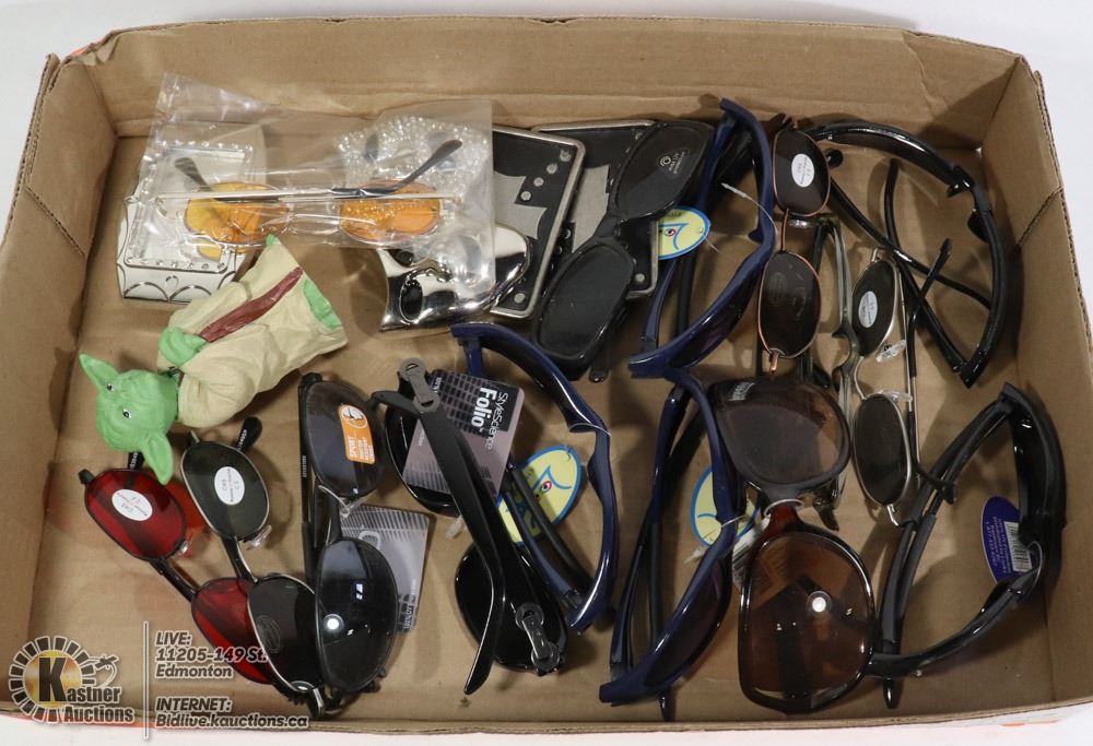 UNCLAIMED FLAT OF SUNGLASSES AND BELT BUCKLES