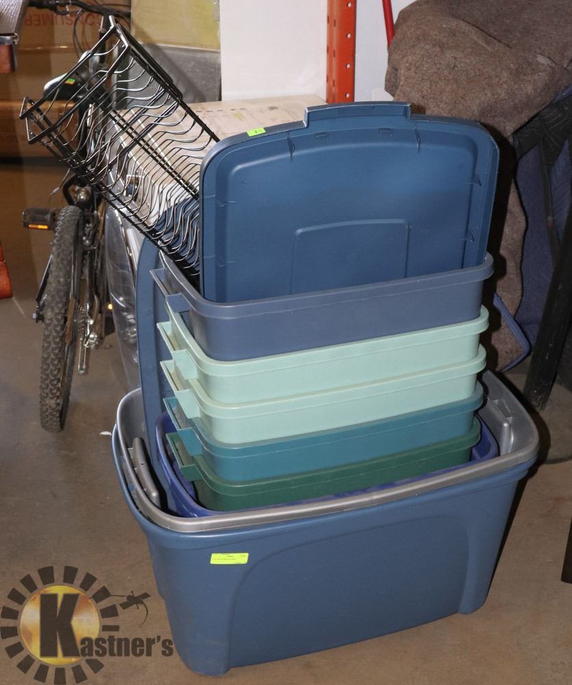 UNCLAIMED STACK OF ASSORTED TOTES AND CD RACKS