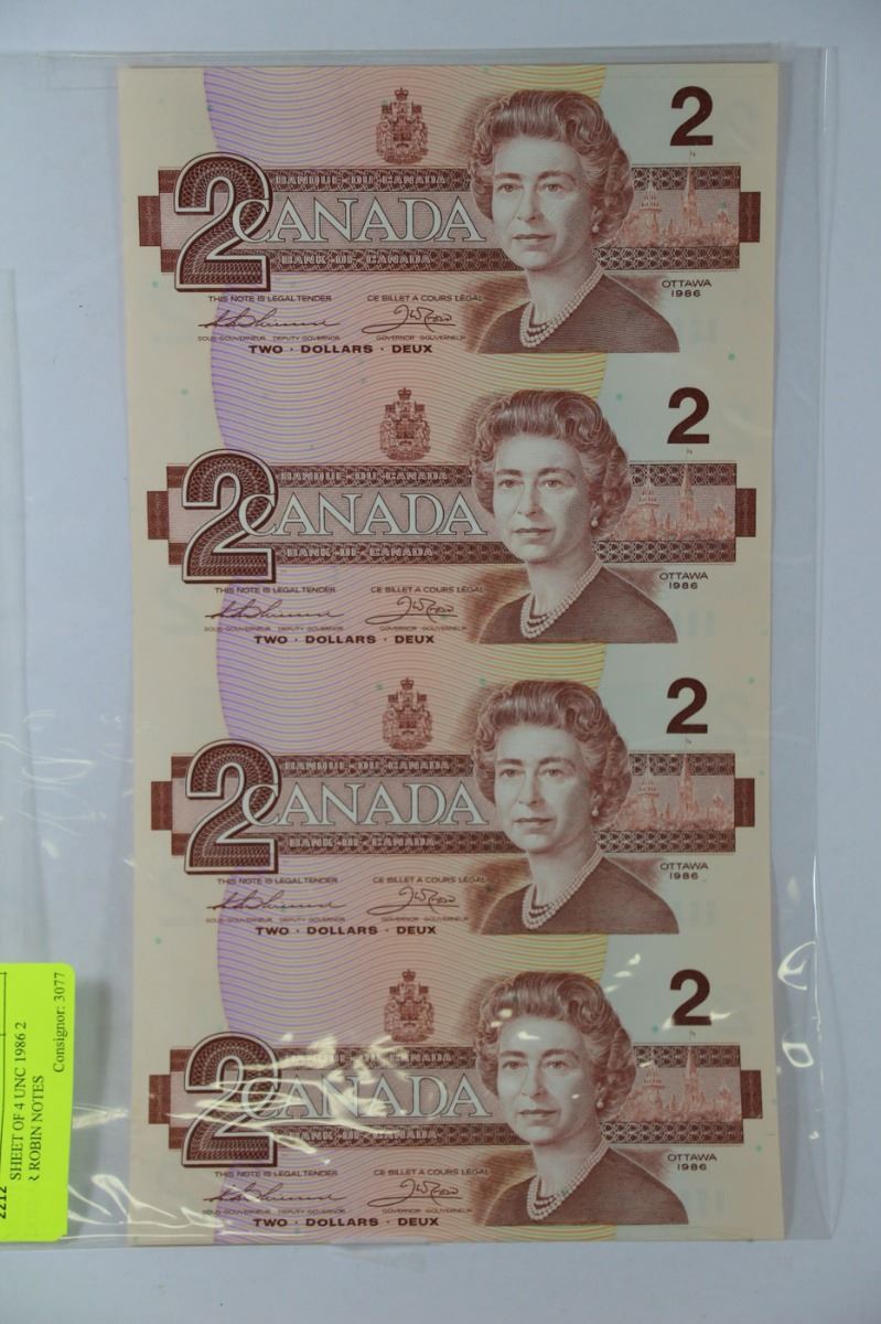 UNCUT SHEET OF 4 UNC 1986 2 DOLLAR ROBIN NOTES