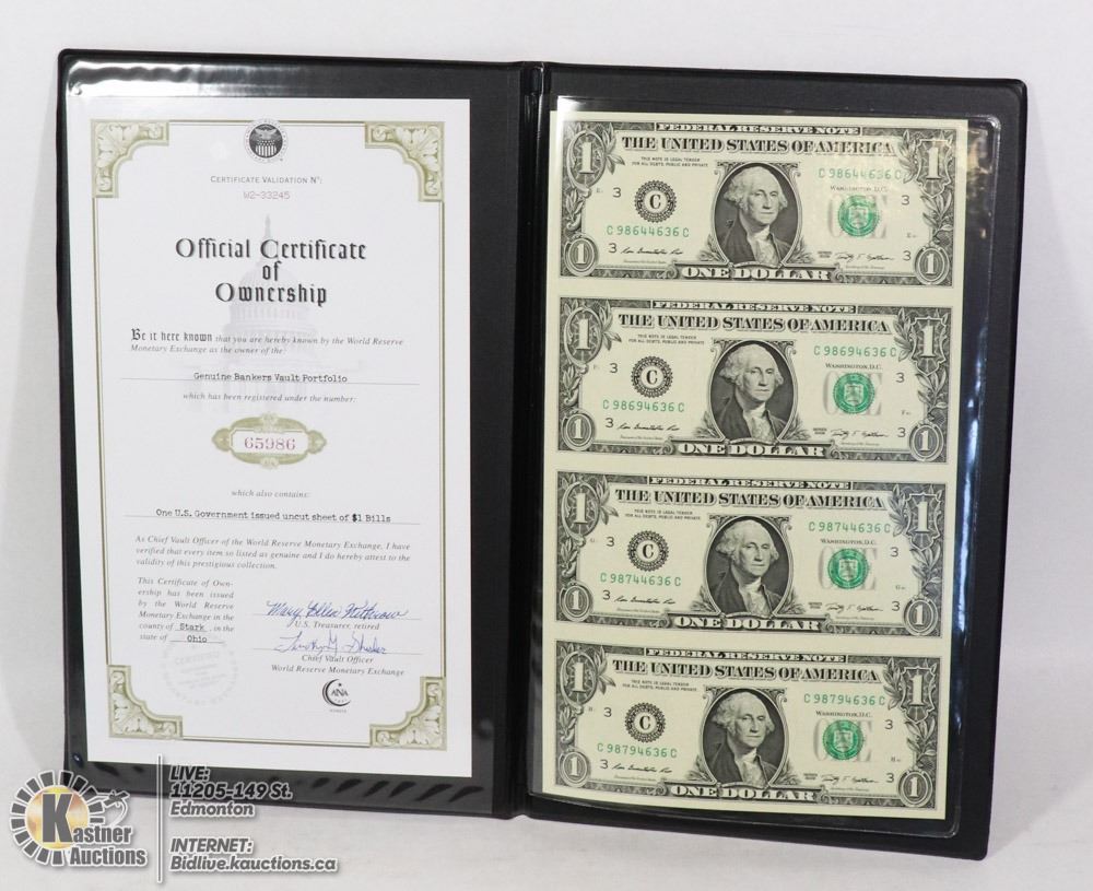 UNCUT SHEET OF 4 USA DOLLAR BILLS WITH COA