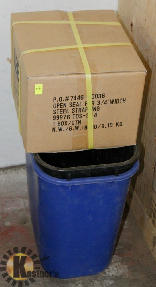 STEEL STRAPPING (BOX IS 9.1KG) SOLD WITH TWO GARBAGE CANS***LOCATED AT 12106 163 STREET NW, EDMONTON, MUST BRING OWN HELP AND ANY EQUIPMENT NEEDED TO PICK UP ITEM