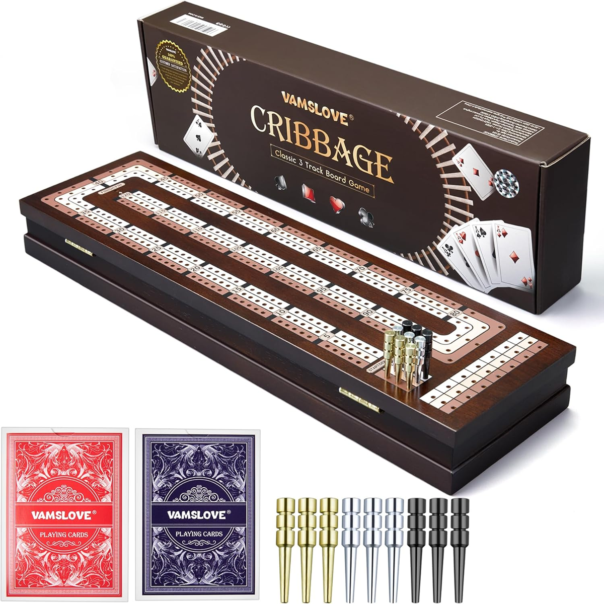 VAMSLOVE WOODEN CRIBBAGE BOARD GAME MAGNETIC 3-TRACK SCOREBOARD WITH LARGE SLOTS FOR STORING 2 PLAYING CARDS AND 9 METAL PEGS, TRAVEL FAMILY GAME NIGHT (INSTRUCTION INCLUDED