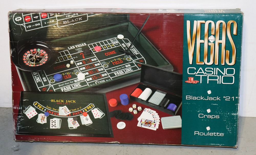 INCLUDES BLACKJACK, CRAPS, AND ROULETTE. WOOD CABINET WITH FELT PLAYING SURFACES. HOME - GAMES