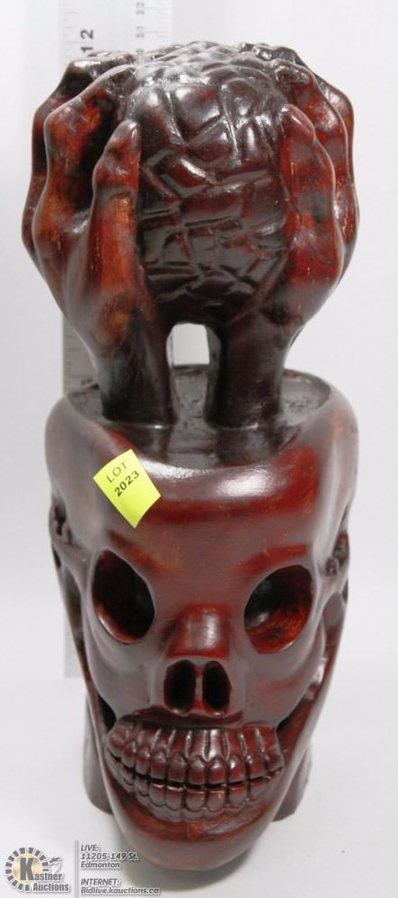 VERY HEAVY CARVED SKULL BRAIN IN HANDS STATUE