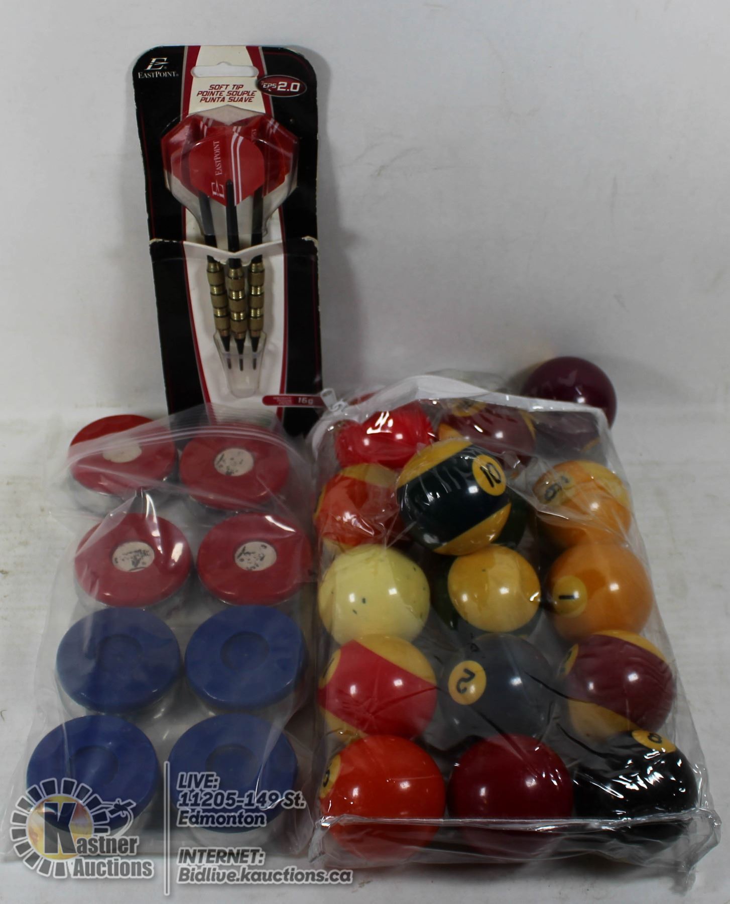 & 6 SUFFLE BOARD PUCKS W/SEALED EAST POINT 3 PACK DARTS 16 G