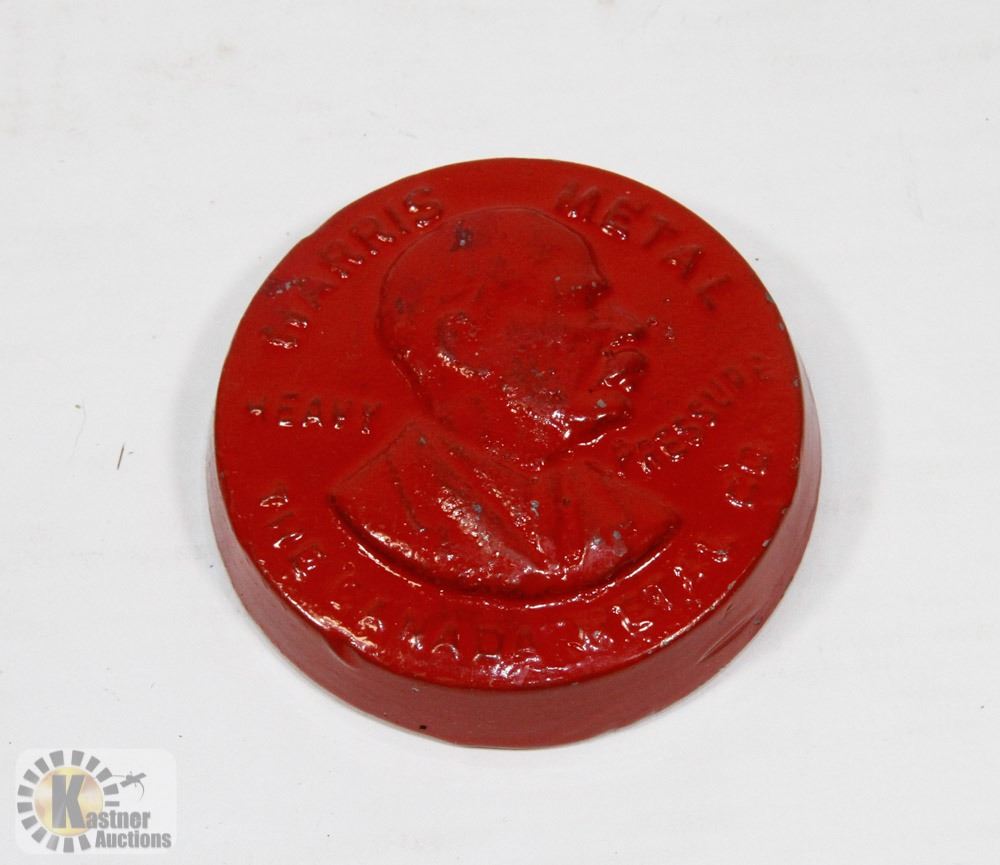 PAPER WEIGHT; HARRIS METAL HEAVY PRESSURE; 3.5" DIAMETER; 2 LBS.. COLLECTIBLES.