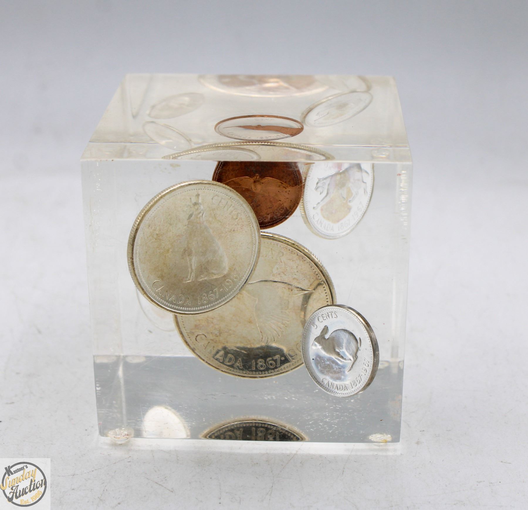 PAPER WEIGHT CUBE WITH 1867-1967 COINS ENCASED DOLLAR, 50CENTS, 25 CENTS, 10 CENTS, 5 CENTS, PENNY **ALL ITEMS MUST BE REMOVED BY 5PM SATURDAY, OCTOBER 11TH 2025. ALL REMAINING ITEMS WILL BE SUBJECT TO A $6.00 PER DAY STORAGE CHARGE. ANY ITEMS REMAINING AFTER MONDAY, NOVEMBER 3RD 2025 WILL BE CONSIDERED FORFEITED. NO REFUNDS WILL BE ISSUED FOR FORFEITED ITEMS. TO SCHEDULE A PICK UP APPOINTMENT CLICK HERE
