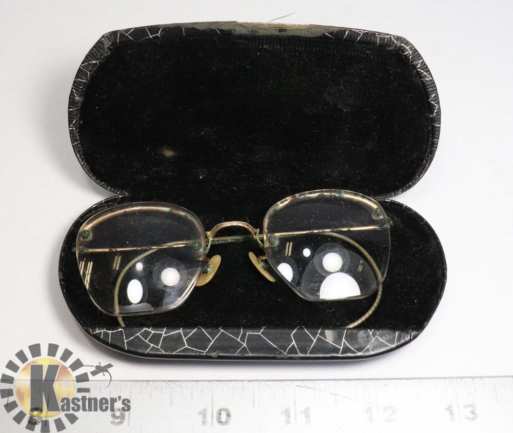 SHAPED EYEGLASSES WITH LENS & ORIGINAL CASE (WILLIAM INNES & SON EDMONTON). COLLECTIBLES