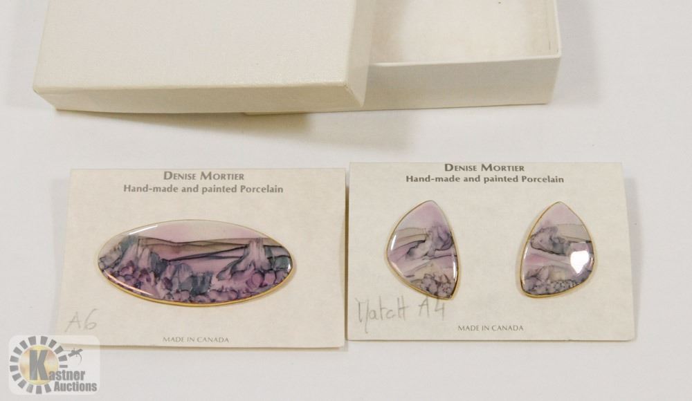 & PAINTED PORCELAIN BROOCH & MATCHING EARRING SET MADE IN CANADA. JEWELRY