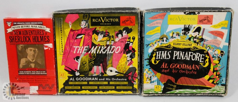 SHERLOCK HOMES ORIGINAL RADIO BROADCAST CASSETTE W/2 RCA VICTOR HMS PINAFORE AL GOODMAN & MIKADO SETS OF 5, 45 RPM. COLLECTIBLES