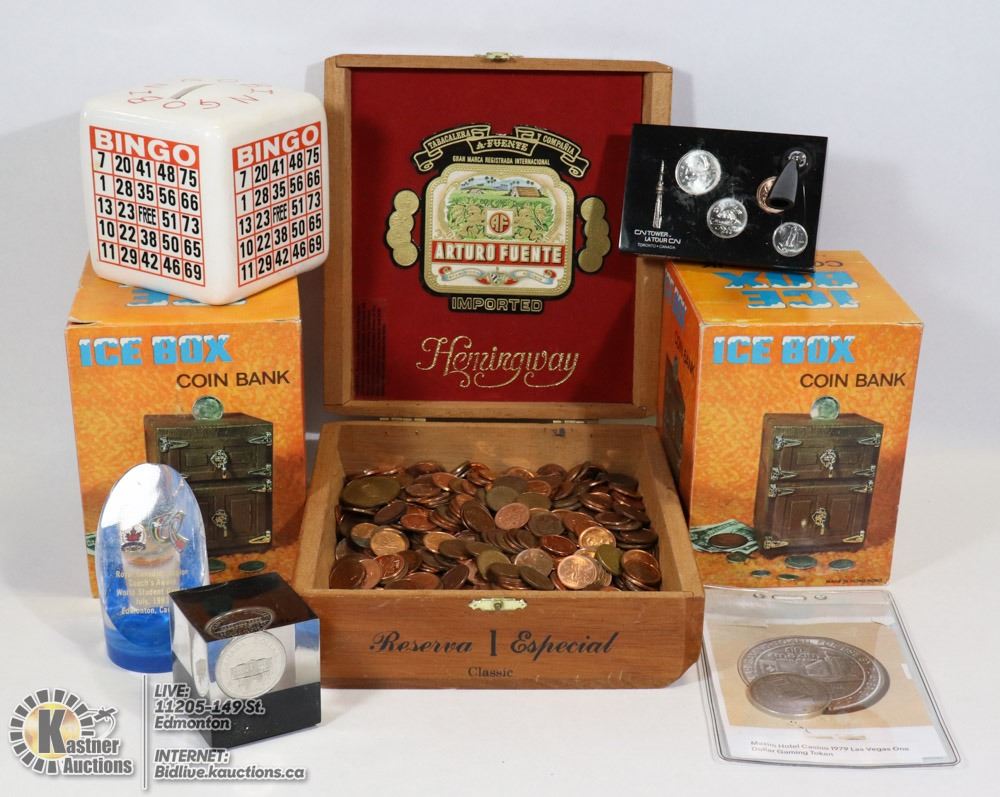 W/BINGO COIN BANK, CIGAR BOX FULL OF OLD PENNIES, MEDALLIONS, INCASED COINS.