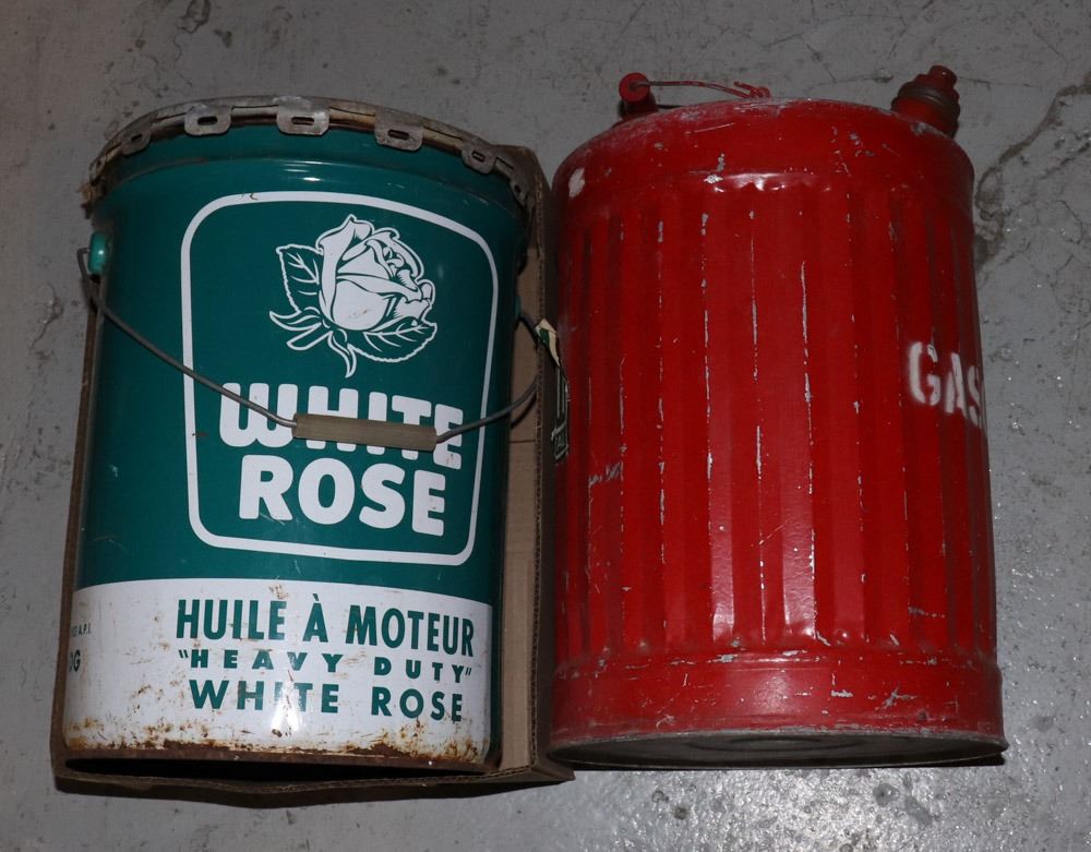 VINTAGE 5 GALLON WHITE ROSE OIL CAN WITH LID. ALSO INCLUDES 5 GALLON GASOLINE CAN WITH LID.-COLLECTIBLES