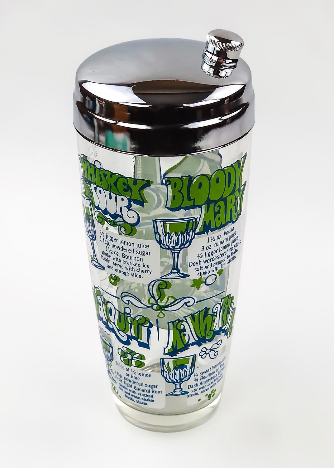 #8780 - BEAUTIFUL VINTAGE COCKTAIL SHAKER WITH CHROME LID AND SCREW CAP, COOL GRAPHICS, MEASURES 9.5” (24 CM) TALL - INCLUDES POUR SPOUT, 3.75” (9.5 CM) TOP GLASS DIAMETER***ITEM(S) LOCATED IN LETHBRIDGE ALBERTA. ALL ITEMS IN THIS AUCTION QUALIFY FOR OUR FREE TRANSPORT TO EDMONTON SERVICE. WORLDWIDE SHIPPING AVAILABLE