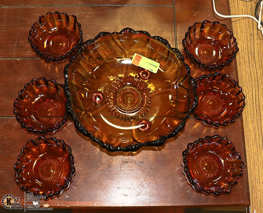 VINTAGE 7 PC AMBER GLASS BOWL SET.
