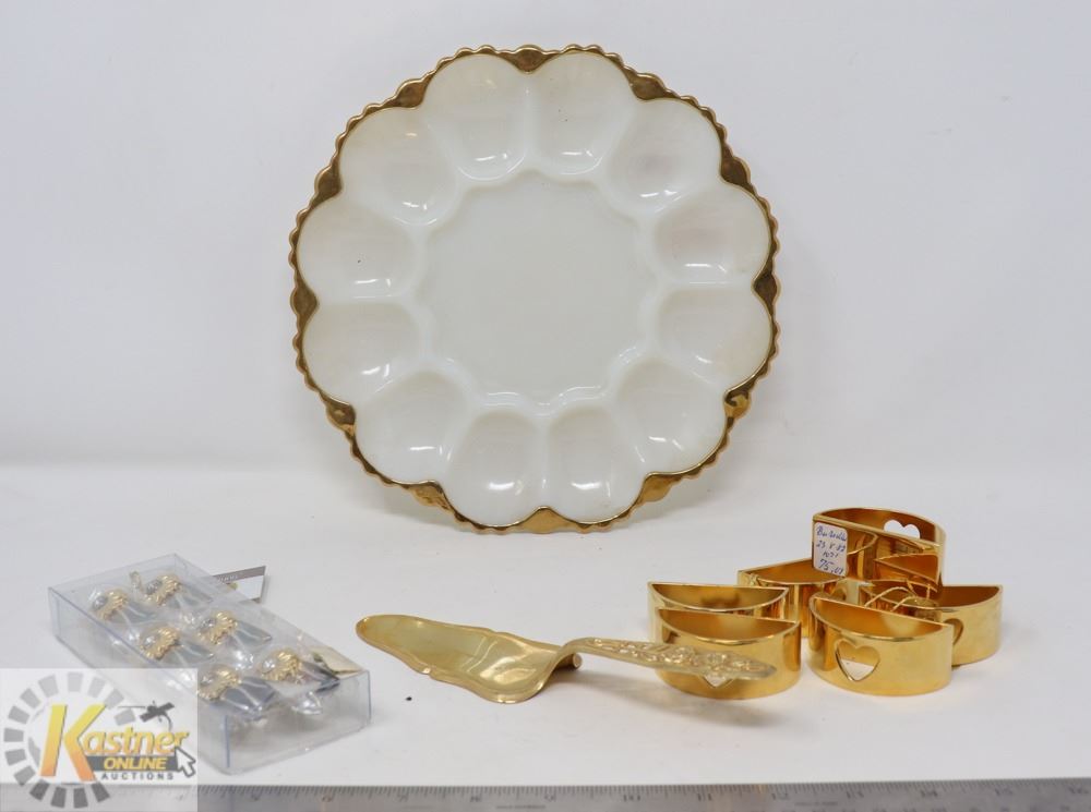 PLATE W/ GOLD TRIM, 24KT GOLD PLATED SET OF 6 NAPKIN RINGS/ KNIFE REST SET & PIE LIFTER