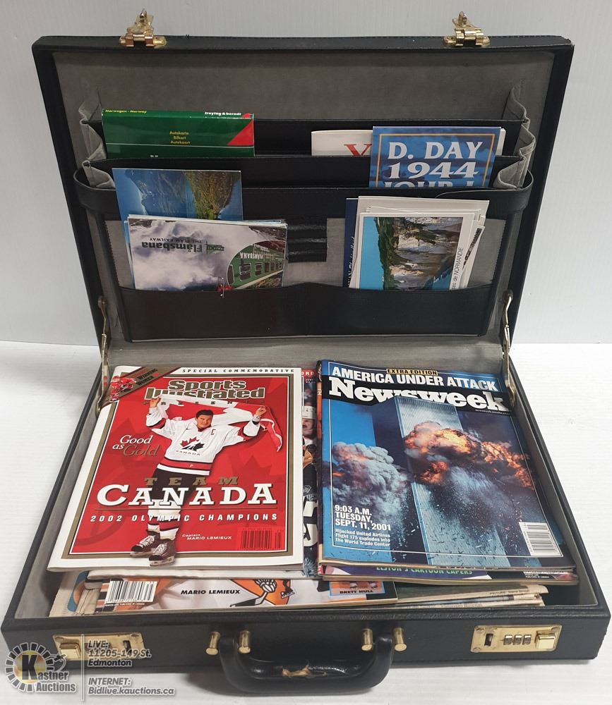 ATTACHE CASE (COMBINATION # SET AT 777), FULL OF VINTAGE COLLECTIBLE HOCKEY MAGAZINES, MAPS, POST CARDS, ETC. - COLLECTIBLES