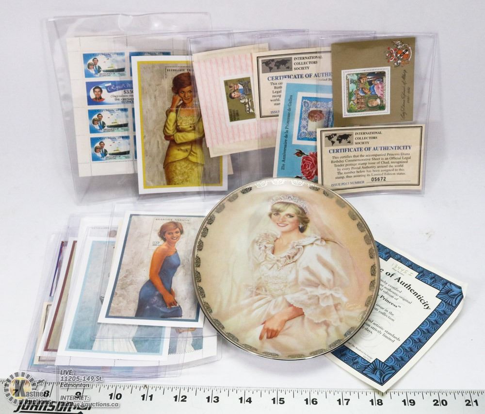 PRINCESS DIANA"QUEEN OF OUR HEARTS DECORATIVE PLATE 1ST ISSUE W/COA & A LOT OF STAMP COLLECTION W/COA. COLLECTIBLES