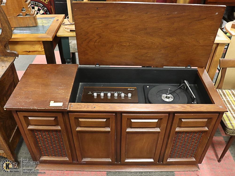 TURN-TABLE & RADIO & RECORD STORAGE COMPARTMENT (48"L X 17"W X 25.5"H) - VINTAGE