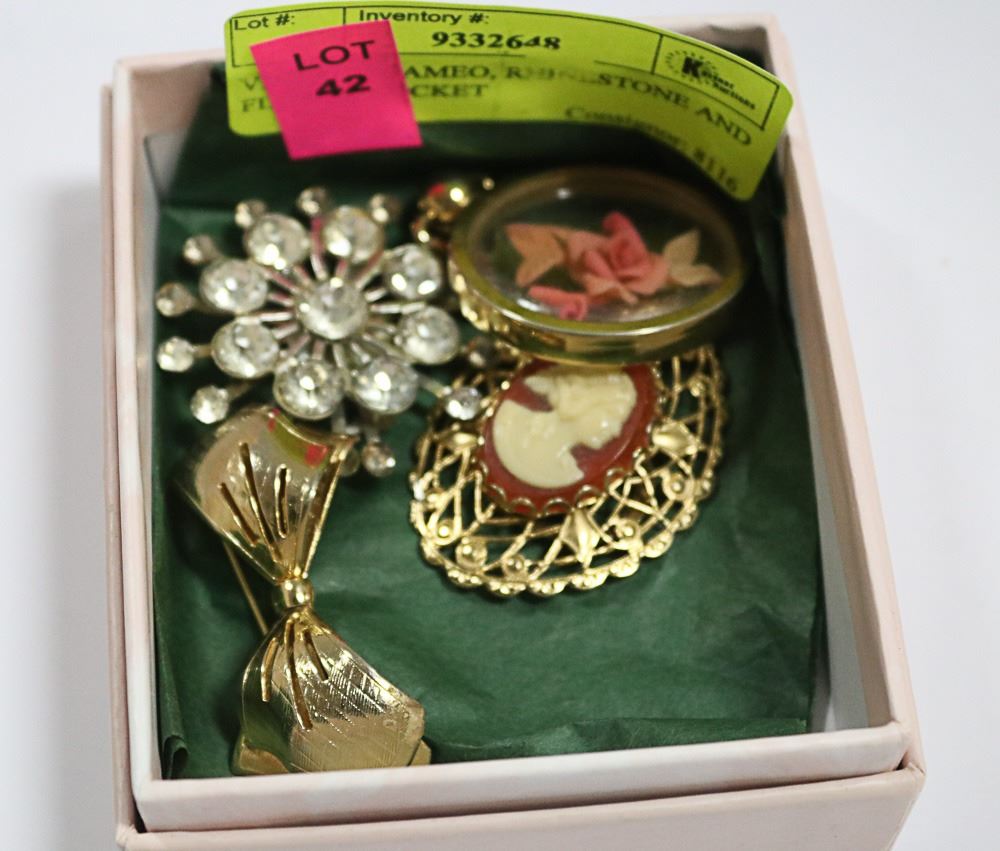 VINTAGE CAMEO, RHINESTONE AND FLOWER LOCKET