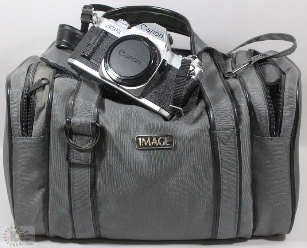 VINTAGE CANON 35MM CAMERA WITH ACCESSORIES AND BAG