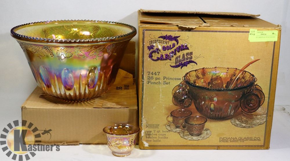 MINT IN BOX. FROM THE 1970’S. IRIDESCENT YELLOW IN COLOUR. 26 PIECES INCLUDES PUNCH BOWL, LADLE, 12 MUGS AND 12 HOOKS ALL IN ORIGINAL BOX. ALL PIECES IN MINT CONDITION, NO CHIPS, CRACKS, SCRATCHES OR WEAR.-COLLECTIBLES