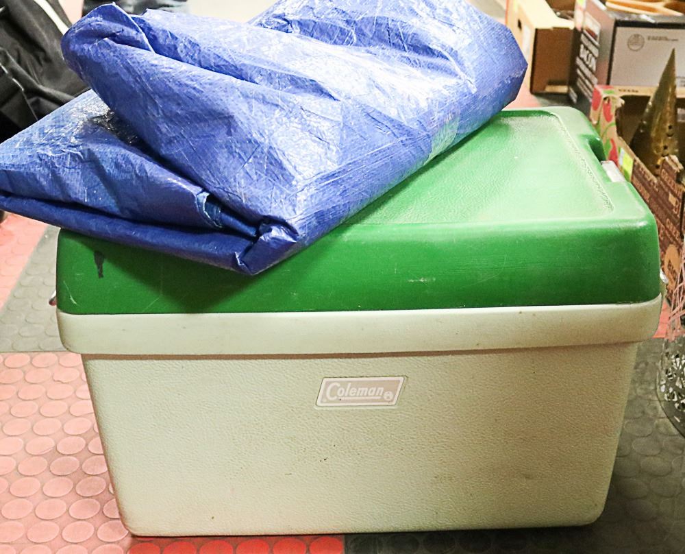 VINTAGE COLEMAN COOLER WITH 12 X 20 TARP