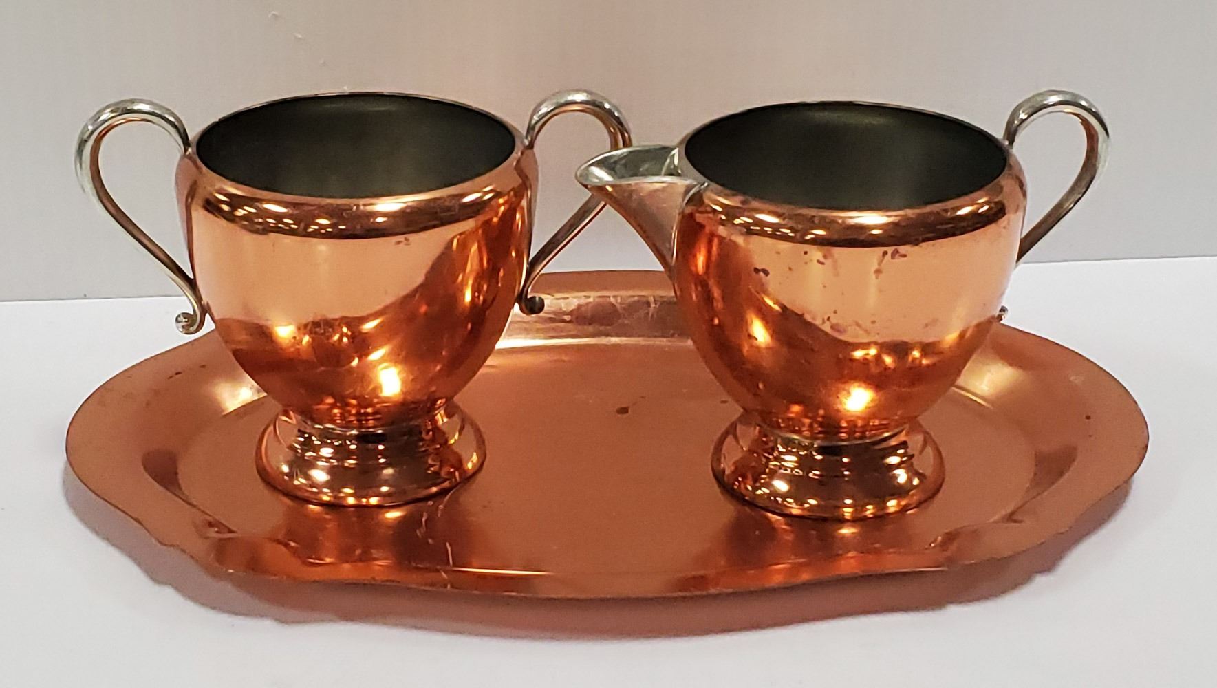 VINTAGE COPPER CREAM & SUGAR SET ON TRAY