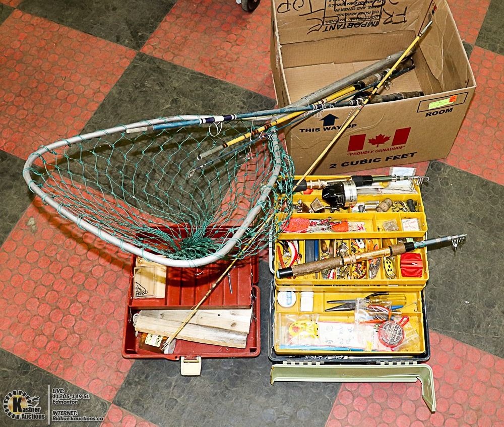 VINTAGE FISHING EQUIPMENT- 4 RODS, 2 TACKLE BOXES