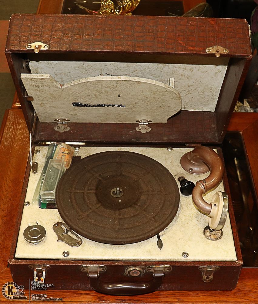 UP PORTABLE SUITCASE RECORD PLAYER WITH EXTRA NEEDLES, HAS WINDER, WORKING CONDITION (APPROX. 1940'S) - COLLECTIBLES