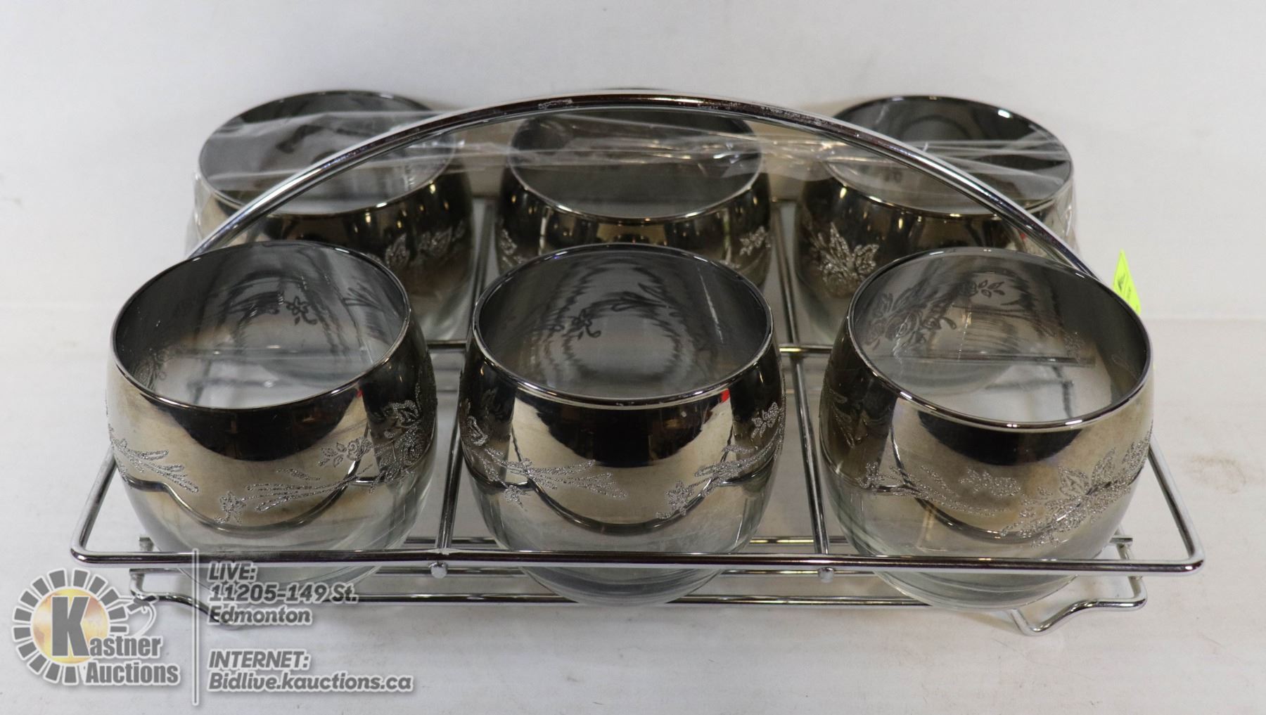 EACH GLASS HAS DARK SILVER TOP AND ETCHED FLORAL DESIGN, THERE ARE 6 GLASSES IN A WIRE HOLDER WITH A HANDLE
