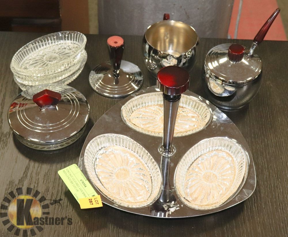 TRAYS INCLUDING RELISH SERVING TRAY WITH INSERTS AND CREAM AND SUGAR SERVERS WITH RED BAKELITE HANDLES. COLLECTIBLES