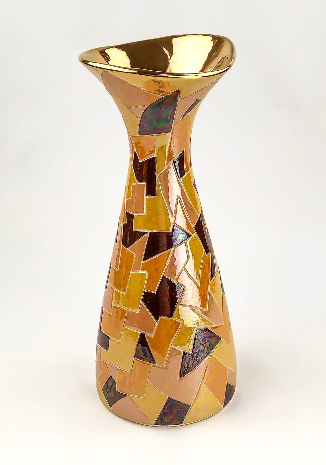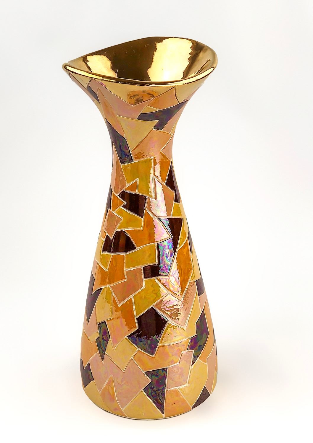 #8025 - GOLD COLOR TRIP AT TOP, GEOMETRIC SHAPES DESIGNS, 5” (13 CM) DIAMETER BASE, 12.5” (32 CM) HIGH***ITEM(S) LOCATED IN LETHBRIDGE ALBERTA. ALL ITEMS IN THIS AUCTION QUALIFY FOR OUR FREE TRANSPORT TO EDMONTON SERVICE. WORLDWIDE SHIPPING AVAILABLE