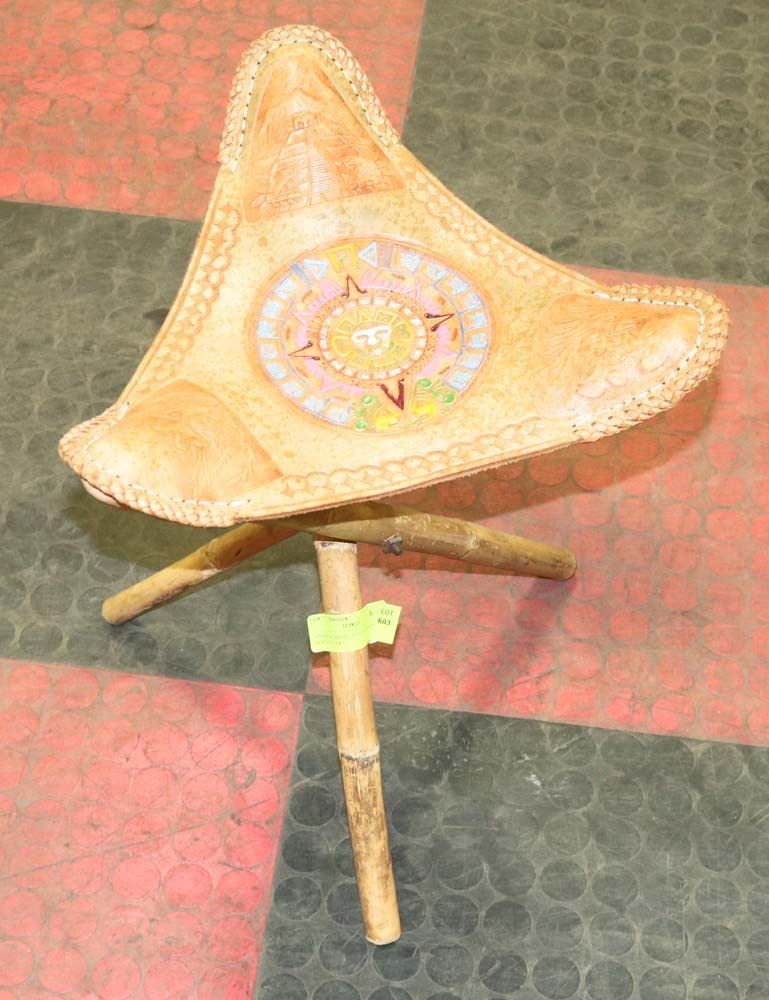 VINTAGE HAND TOOLED LEATHER TRIPOD STOOL