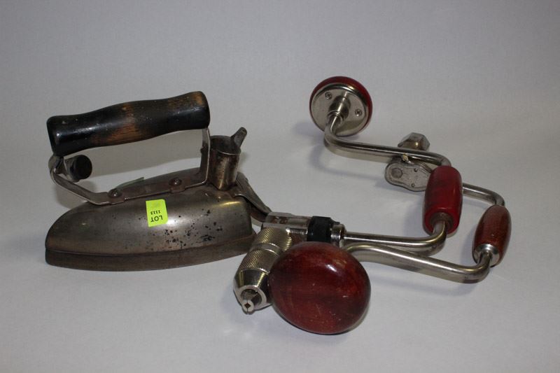 VINTAGE HOTPOINT SAD IRON & TWO VINTAGE HAND DRILL
