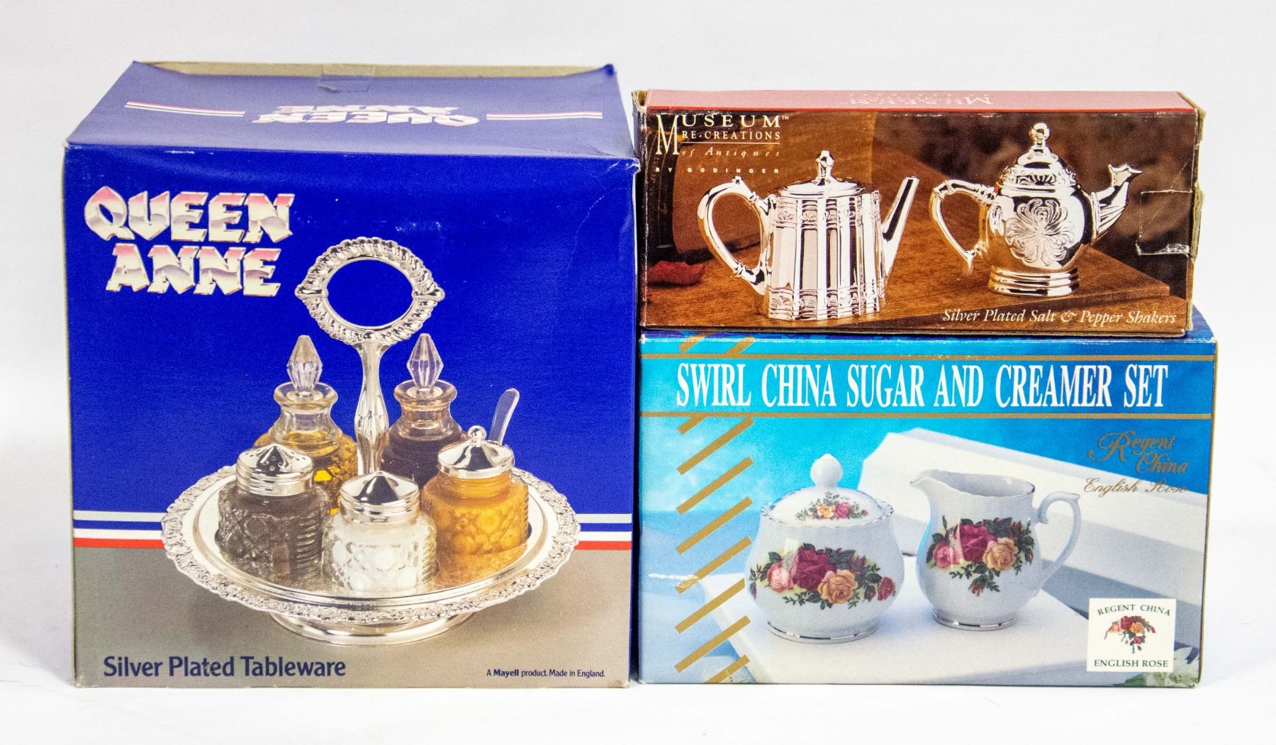 ANNE SILVER PLATED 5 PC REVOLVING CRUET MADE IN ENGLAND, REGENT CHINA ENGLISH ROSE SUGAR BOWL & CREAMER SET & GODINGER MUSEUM SILVER PLATED SALT & PEPPER SHAKERS **ALL ITEMS MUST BE REMOVED BY 5PM SATURDAY, JANUARY 21ST 2023. ALL MAGIC SPACE ITEMS MUST BE REMOVED BY WEDNESDAY, JANUARY 18TH AND ARE LOCATED AT 9058-22 AVENUE SW #102. **ALL REMAINING ITEMS WILL BE SUBJECT TO A $6.00 PER DAY STORAGE CHARGE. ANY ITEMS REMAINING AFTER MONDAY, FEBRUARY 6TH, 2023 WILL BE CONSIDERED FORFEITED. NO REFUNDS WILL BE ISSUED FOR FORFEITED ITEMS. TO SCHEDULE A PICK UP APPOINTMENT CLICK HERE