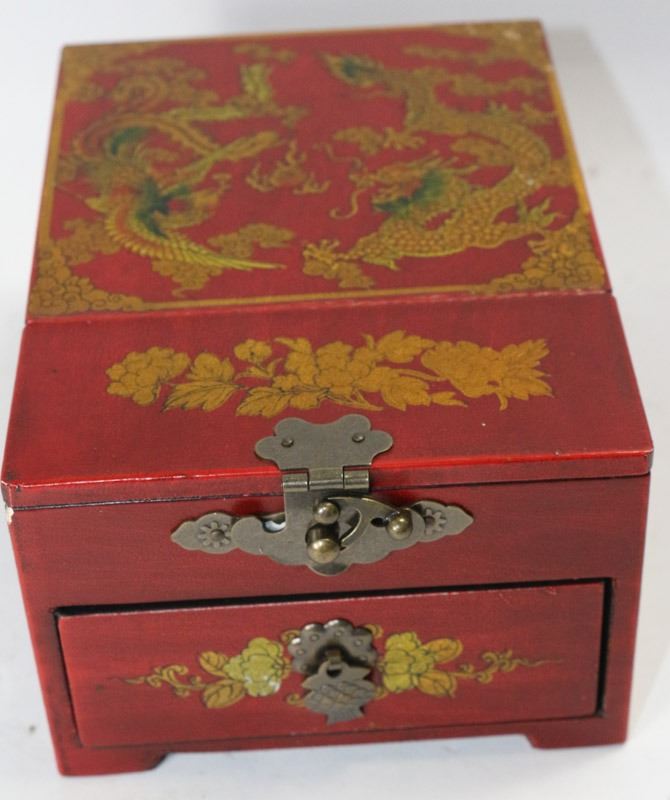 3" X 4.5" X 6" This vintage jewelry box comes with a built in mirror, 1 drawers . Made with solid wood frame ensconced in a thin layer of leather that is stretched tightly and hand-painted with traditional Chinese scenes.