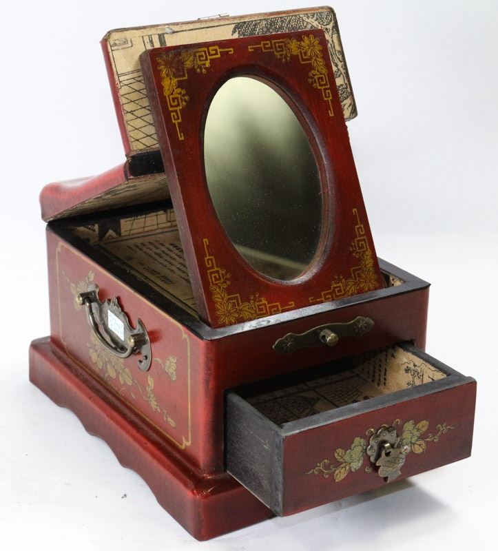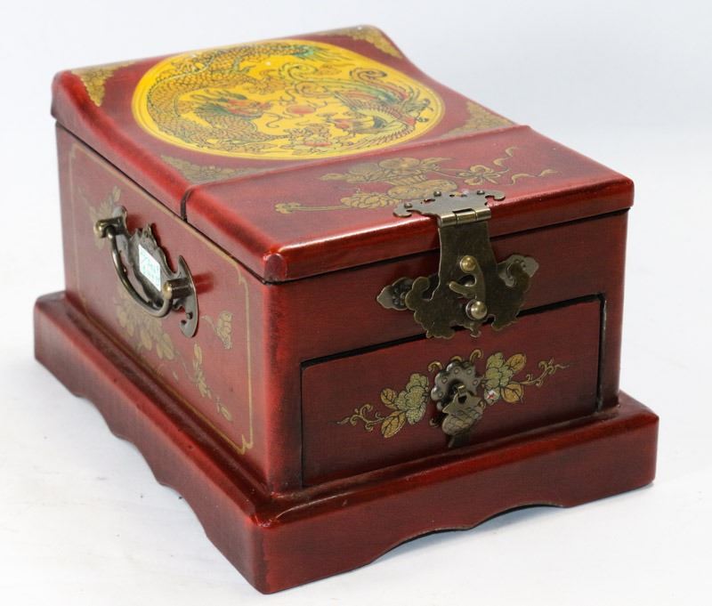 4" X 5.5" X 7" This vintage jewelry box comes with a built in mirror, 1 drawers . Made with solid wood frame ensconced in a thin layer of leather that is stretched tightly and hand-painted with traditional Chinese scenes.