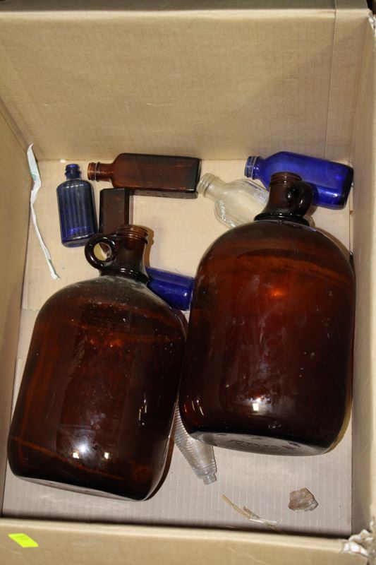 VINTAGE MEDICINE BOTTLES & 2 DIAMOND GLASS JUGS