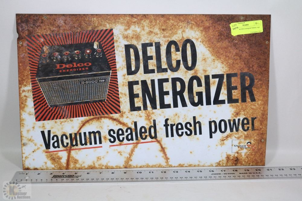 VINTAGE METAL DELCO ENERGIZER BATTERY SIGN 21"x13"