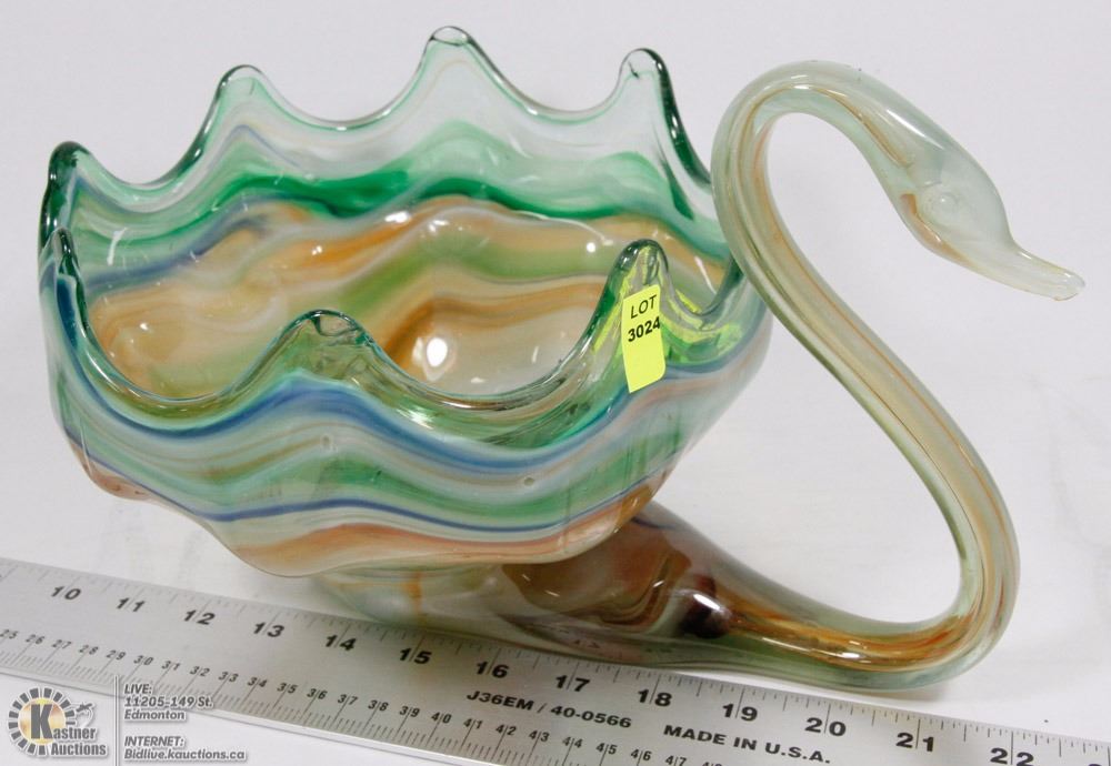 GREEN MULTI COLOR SWIRL GLASS SWAN DISH