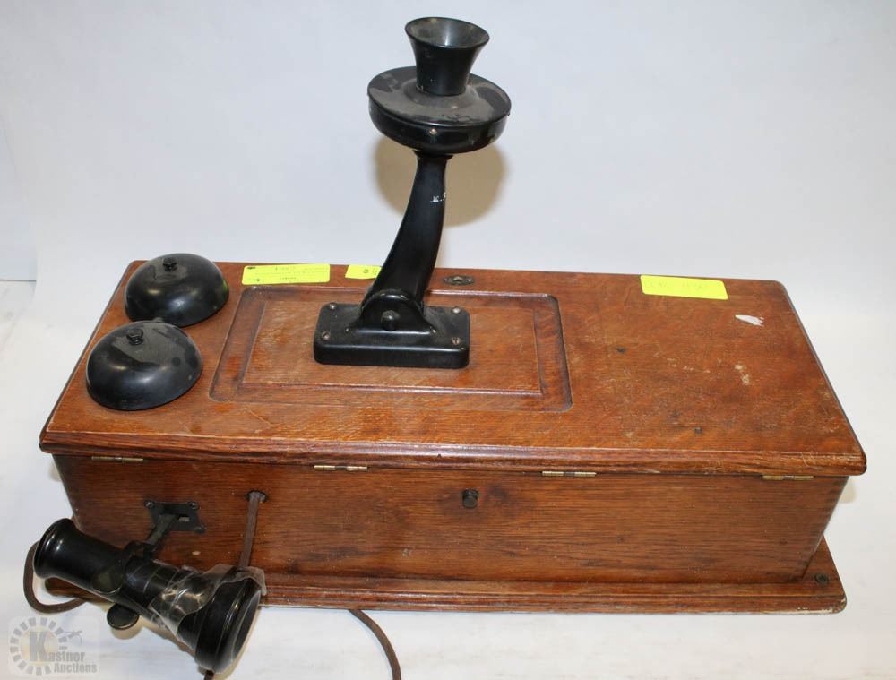 VINTAGE OAK WALL PHONE COMPLETE(HAS A CRACK)