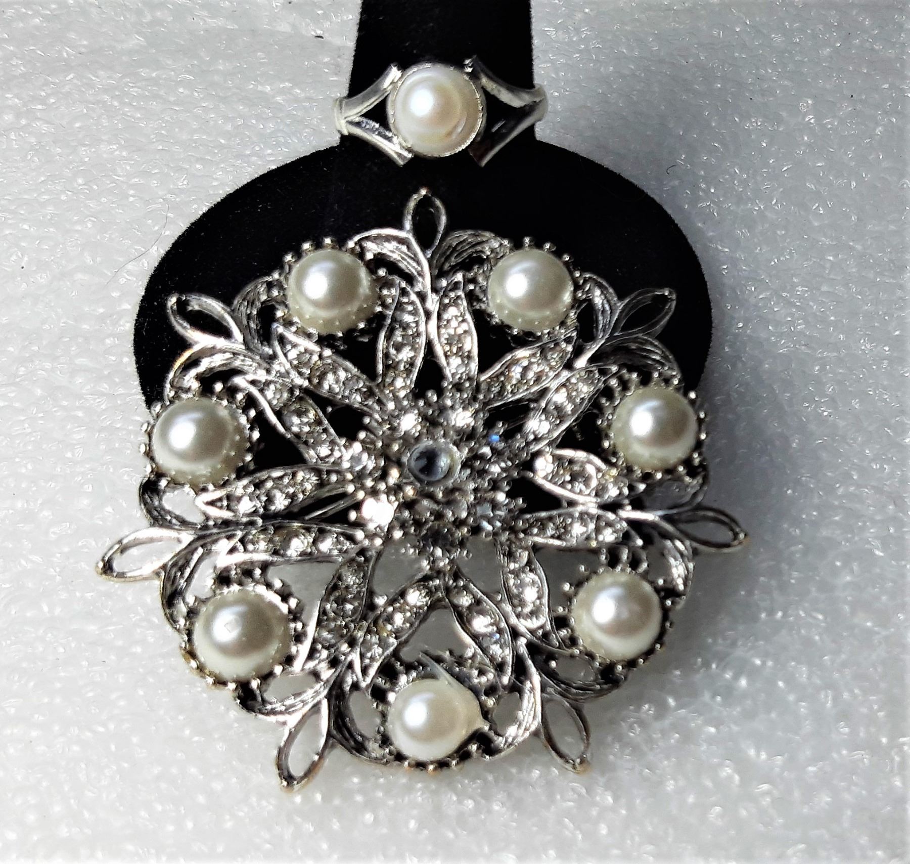 ROUND BROOCH, 2" DIAMETRE AND SIZE 6 RING. JEWELRY