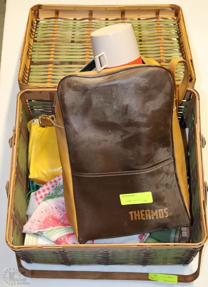 VINTAGE PICNIC BASKET WITH THERMOS CONTAINERS