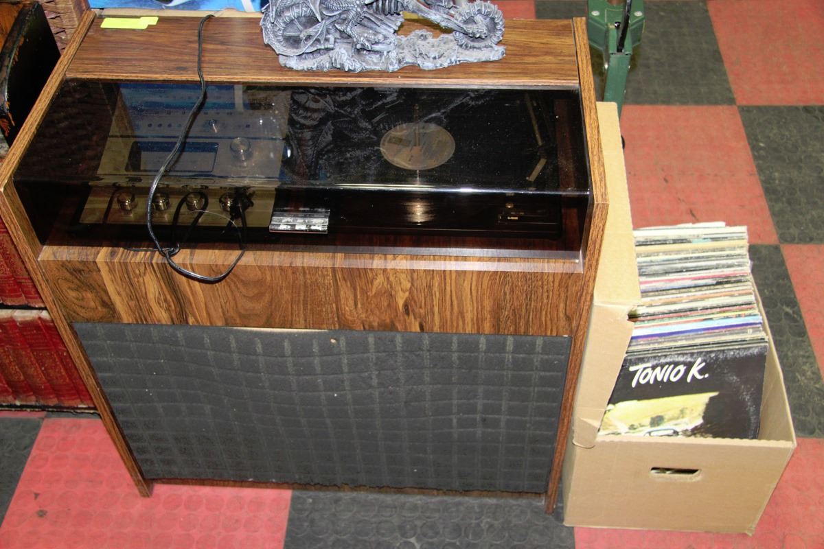 VINTAGE RECORD PLAYER WITH BOX OF RECORDS