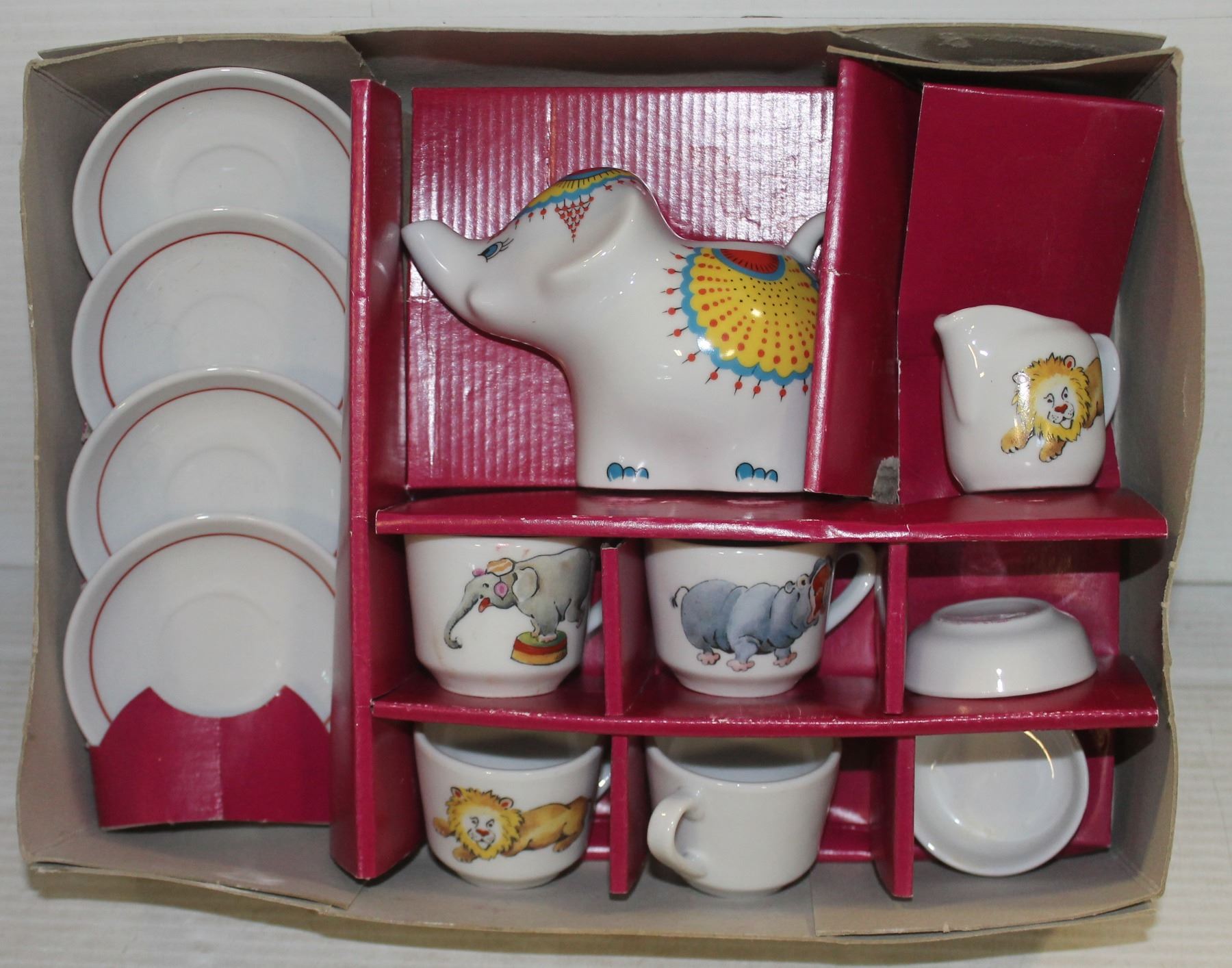 MADE IN GERMANY. CIRCUS PATTERN. IN ORIGINAL BOX. INCLUDES 4 CUPS AND SAUCERS, CREAMER AND TEAPOT. NO CHIPS